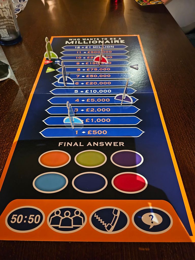 Tonight’s event , run by Kim was ‘Who wants to be a millionaire’ The first round won by Dave. The one in green
